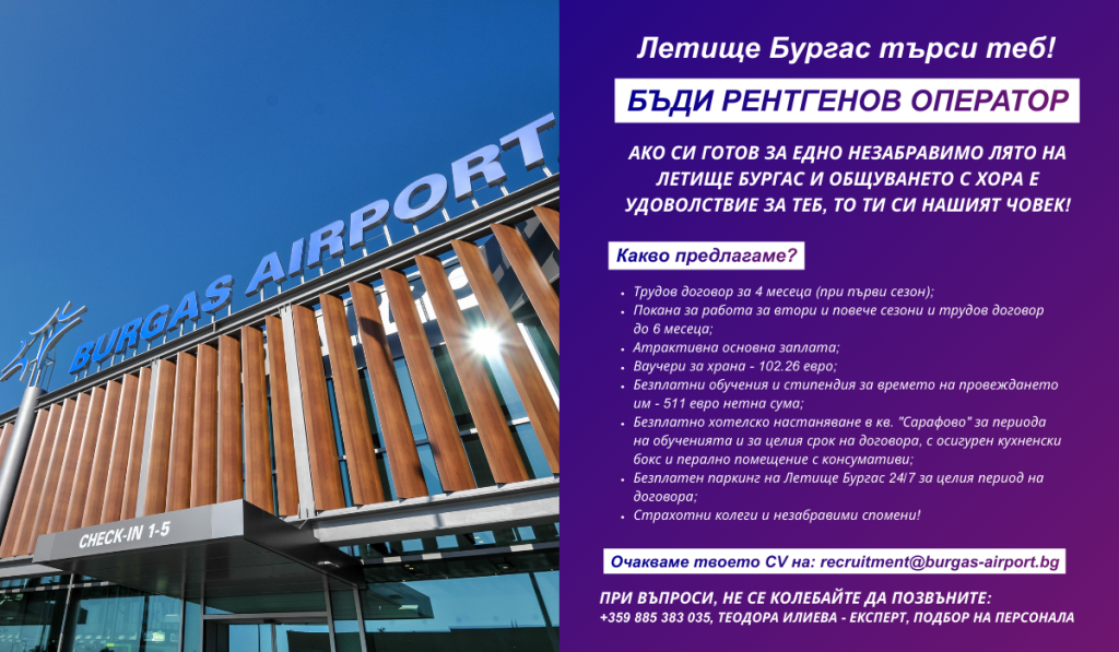 Уведомяваме Ви, че Фрапорт Туин Стар Еърпорт Мениджмънт АД – оператор на Летище Бургас и Летище Варна, обявява прием на документи за сезонна заетост – Лято 2026.